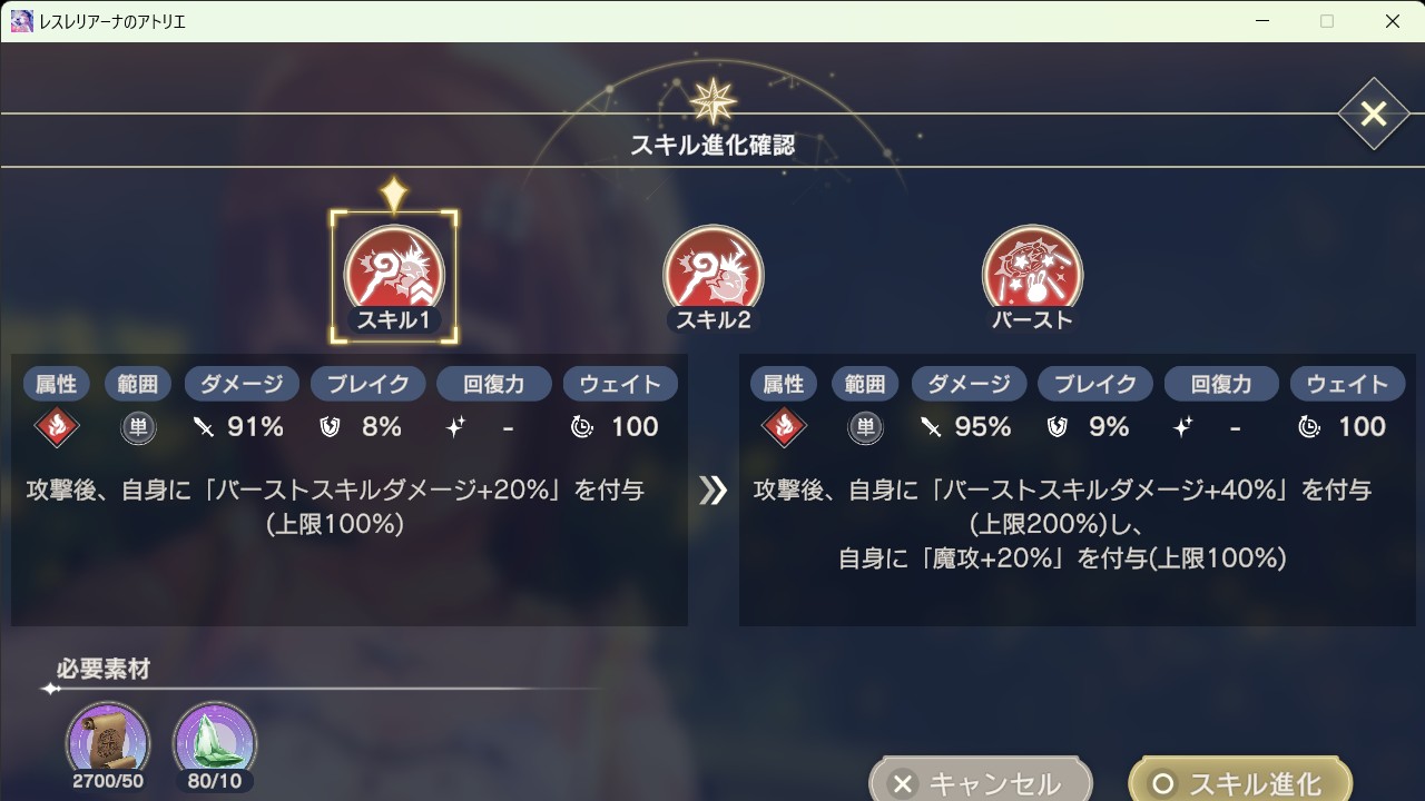 | バーストスキル | 技巧の秘文 ×200 翠晶の結晶 ×10 |