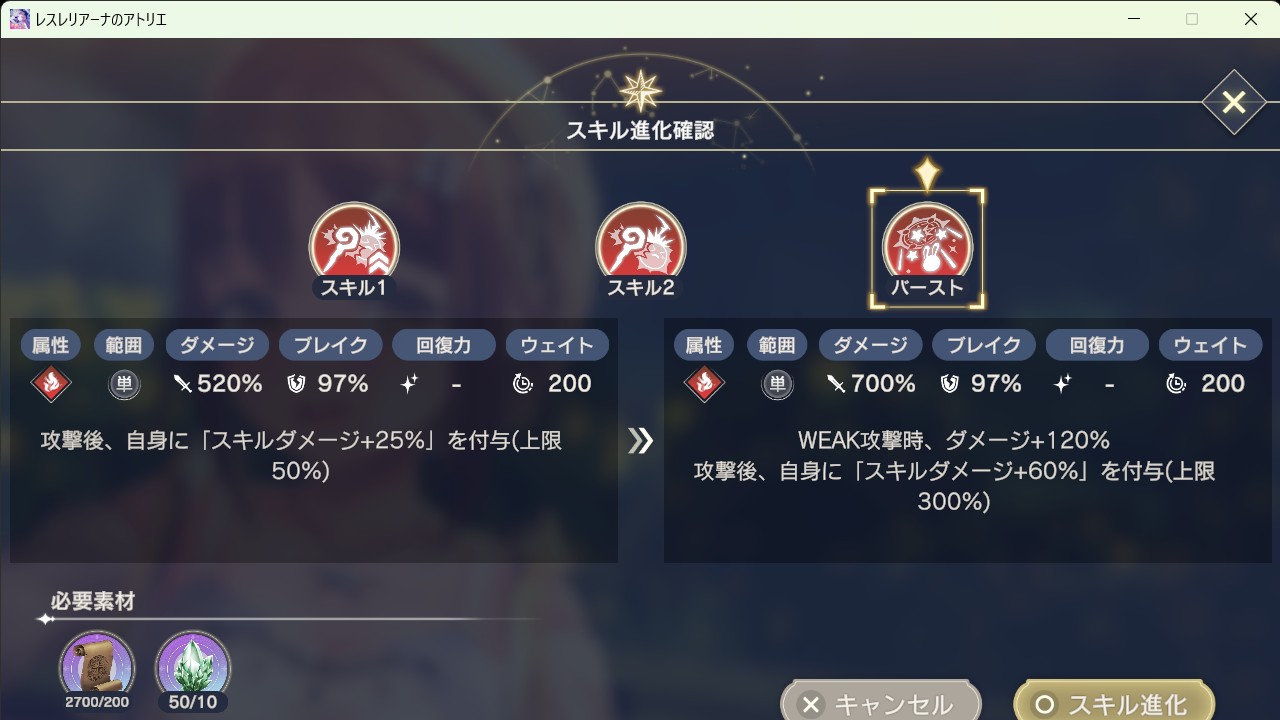 | バーストスキルレベルアップ | ★3→★3.5 | レベル1→2 |