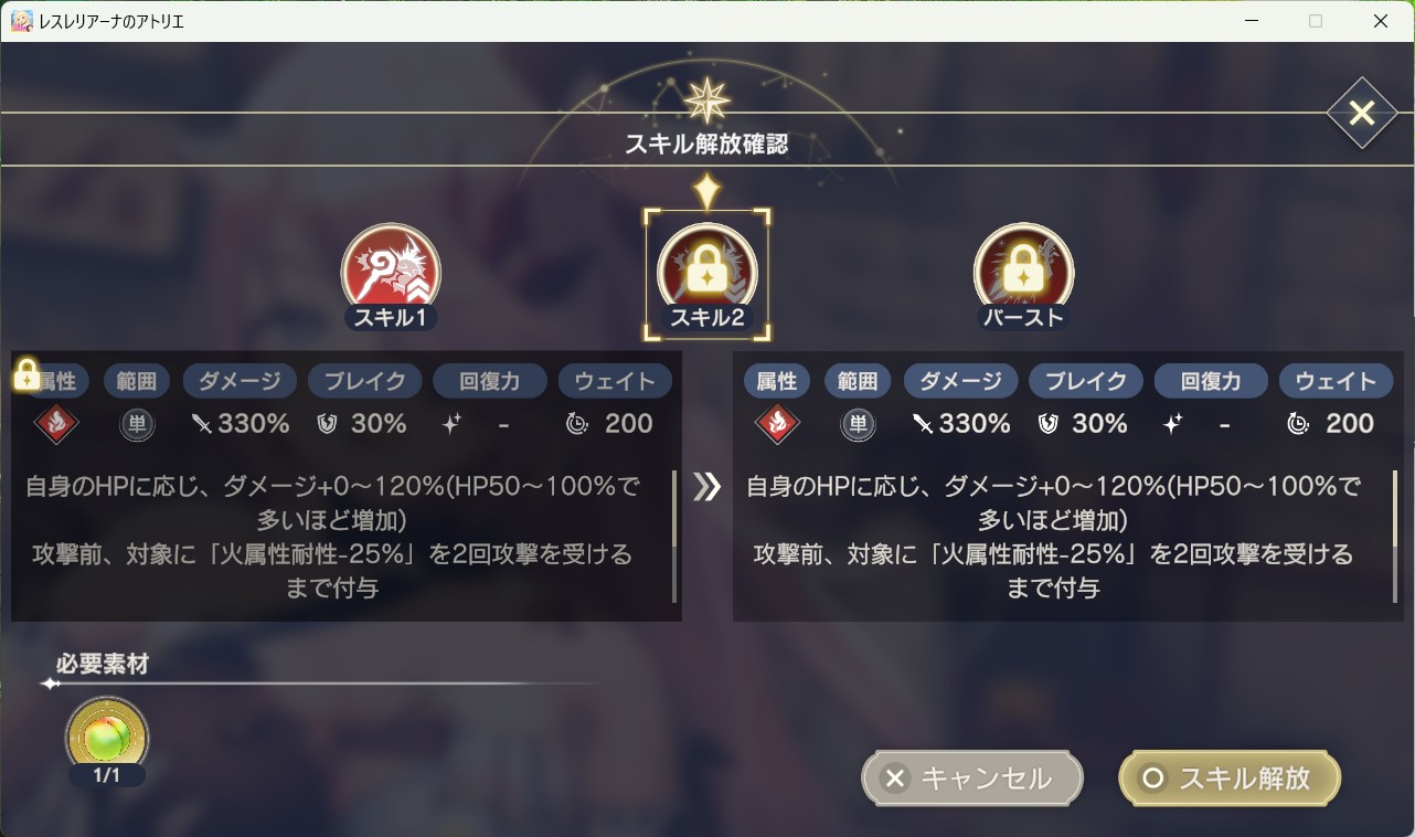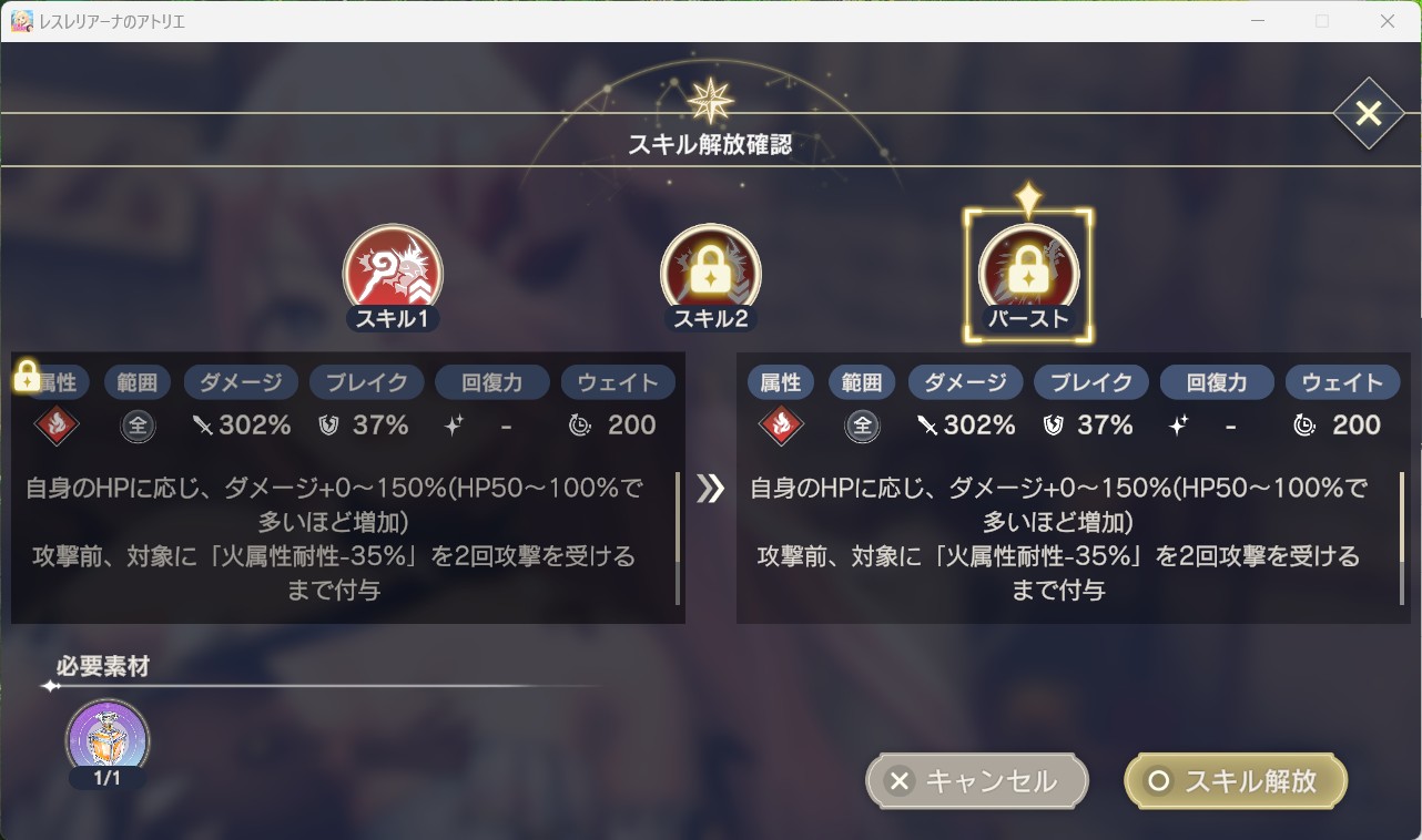 | バーストスキル | 技巧の秘文 ×200 翠晶の結晶 ×10 |