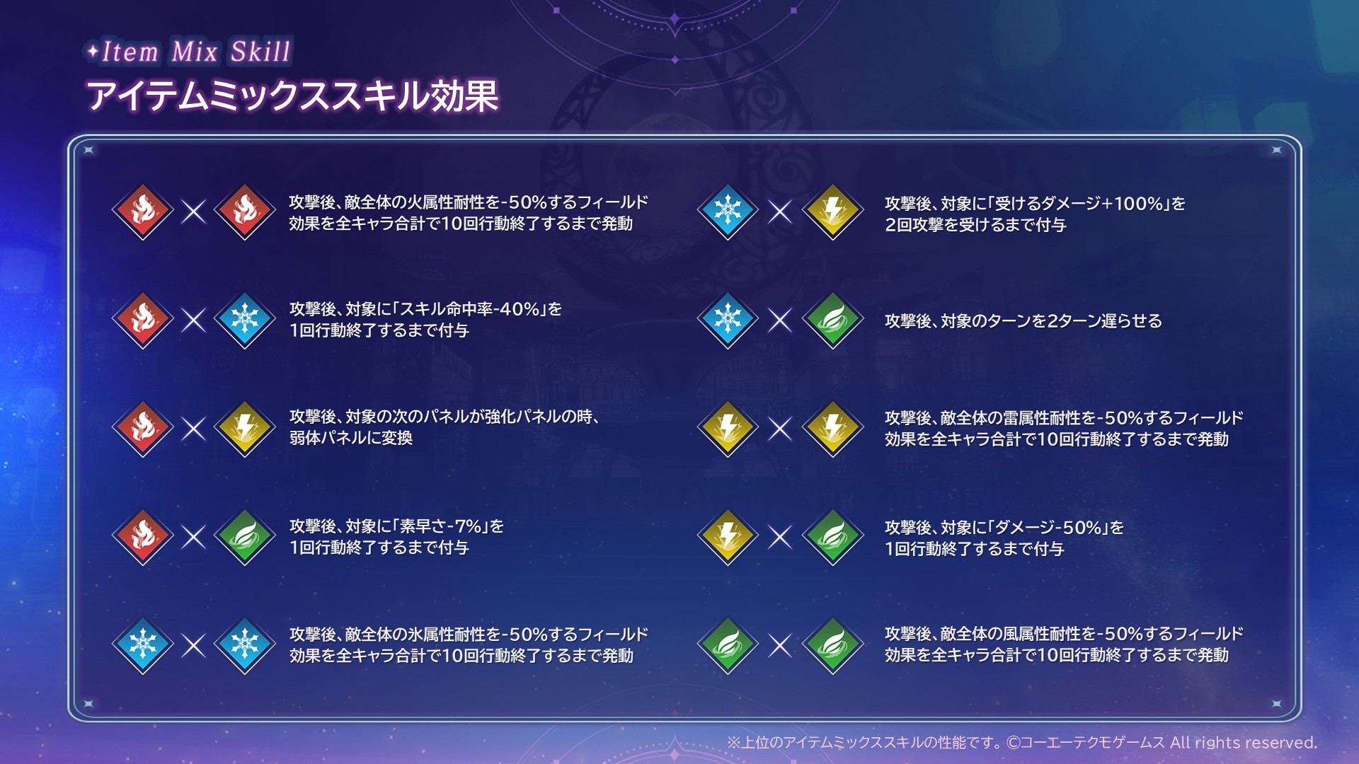 | 火 | 氷 | ネビュラブラインド | 攻撃後、対象に「スキル命中率-40%」を1回行動終了するまで付与 |